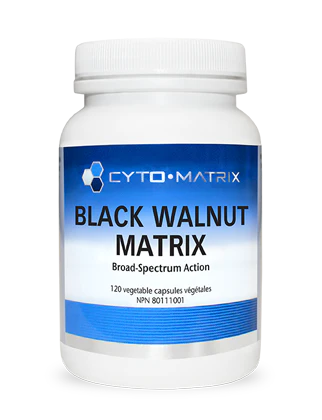 Black Walnut Matrix de Cyto-Matrix combine toutes ces herbes et composés antimicrobiens en un seul mélange puissant pour aider à la santé digestive et à l'équilibre microbien en cas de dysbiose ou d'infection. Collectivement, les ingrédients sont efficaces contre les bactéries pathogènes, les parasites, les champignons (y compris Candida) et les virus. De plus, Black Walnut Matrix offre une action anti-biofilm pour lutter plus efficacement contre les microbes résistants qui ont élu domicile et des mesures de protection pour la survie. Chaque flacon contient 120 gélules végétales.