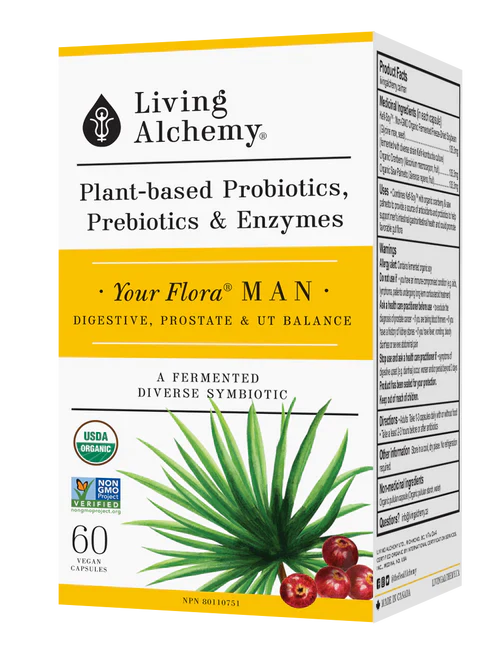 Votre flore HOMME est notre symbiose fermentée Kefir-Kombucha de plus de 45 souches diverses est associé à des ingrédients à base de plantes biologiques et sans OGM ciblés, notamment la canneberge et le palmier nain, pour favoriser des soins sains du système digestif, de la prostate et des voies urinaires.